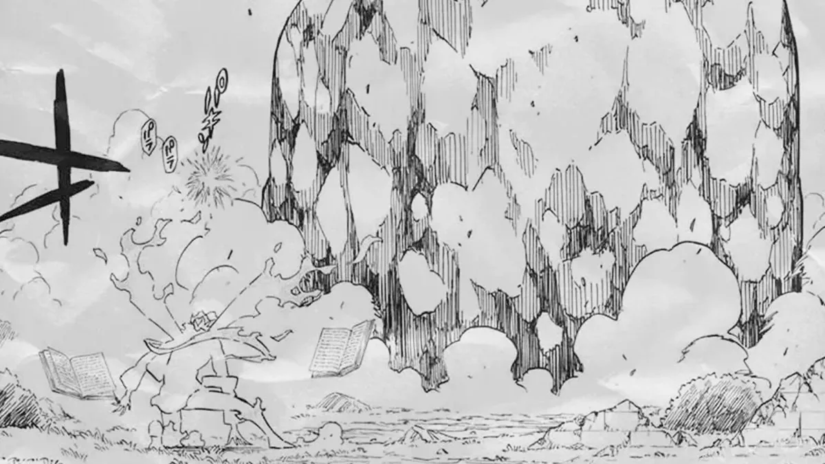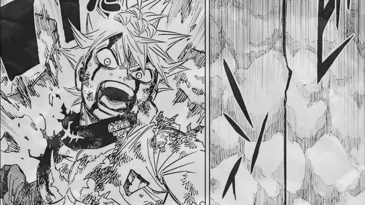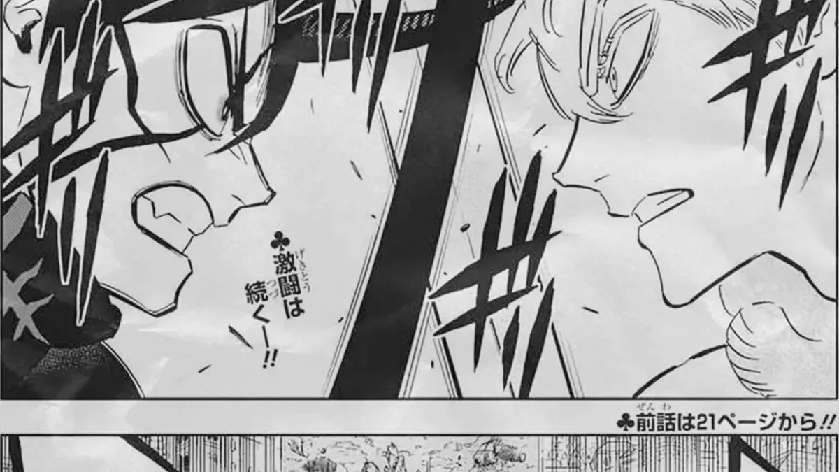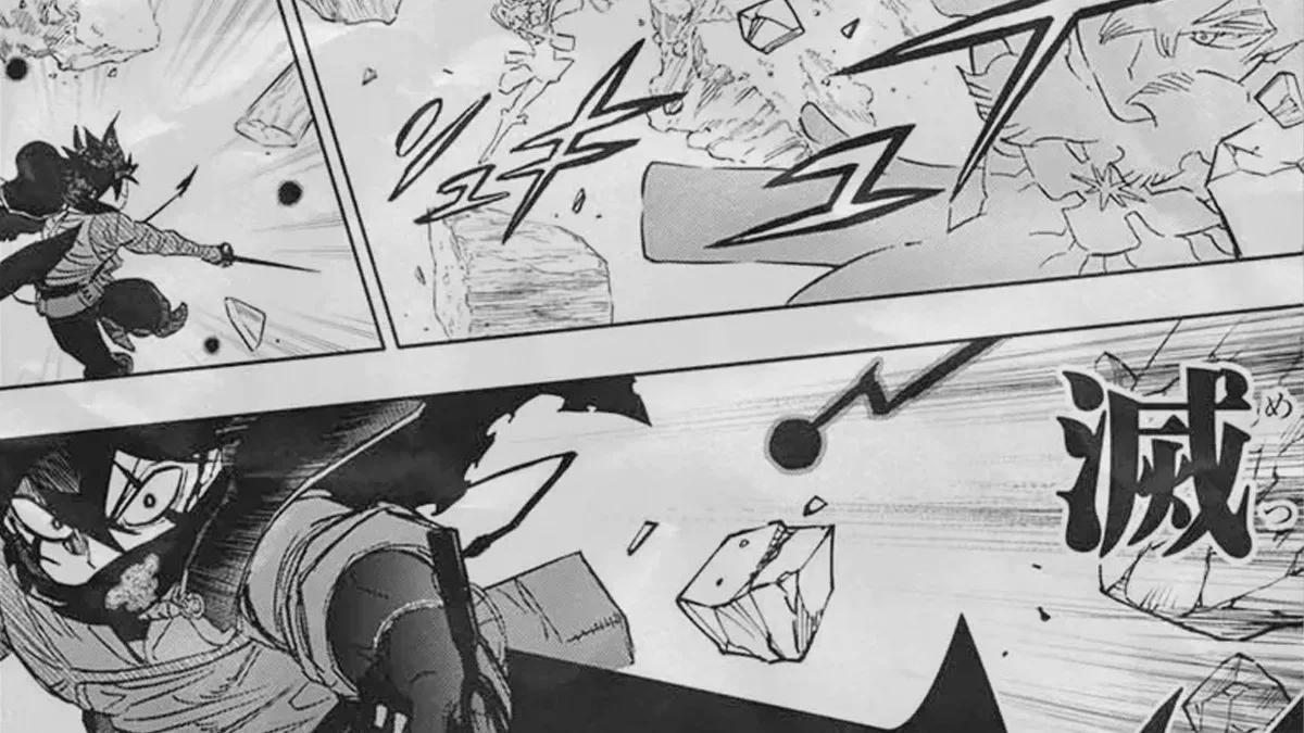 Pendant ce temps, Asta continue de résister en utilisant uniquement sa force physique et sa technique, sans recourir à la magie. Yuno change alors de stratégie et commence à exploiter l'environnement à son avantage, projetant d'énormes débris pour contourner la principale limitation de l'anti-magie.